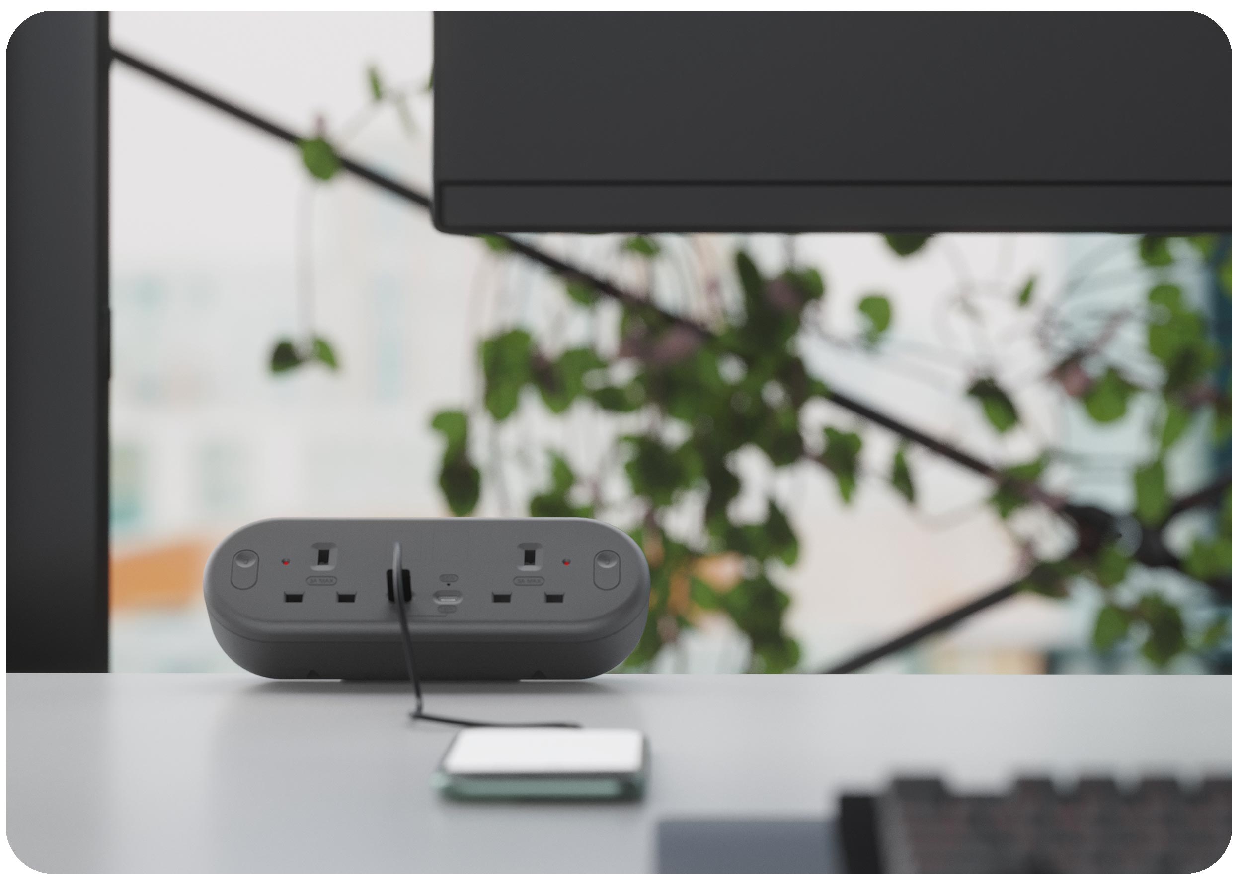 A fixed format on-desk power module offering 2x UK sockets with individual neon switches, resettable 3A circuit breakers and a dual port USB adaptive fast charger for charging laptops, tablets and smart phones.